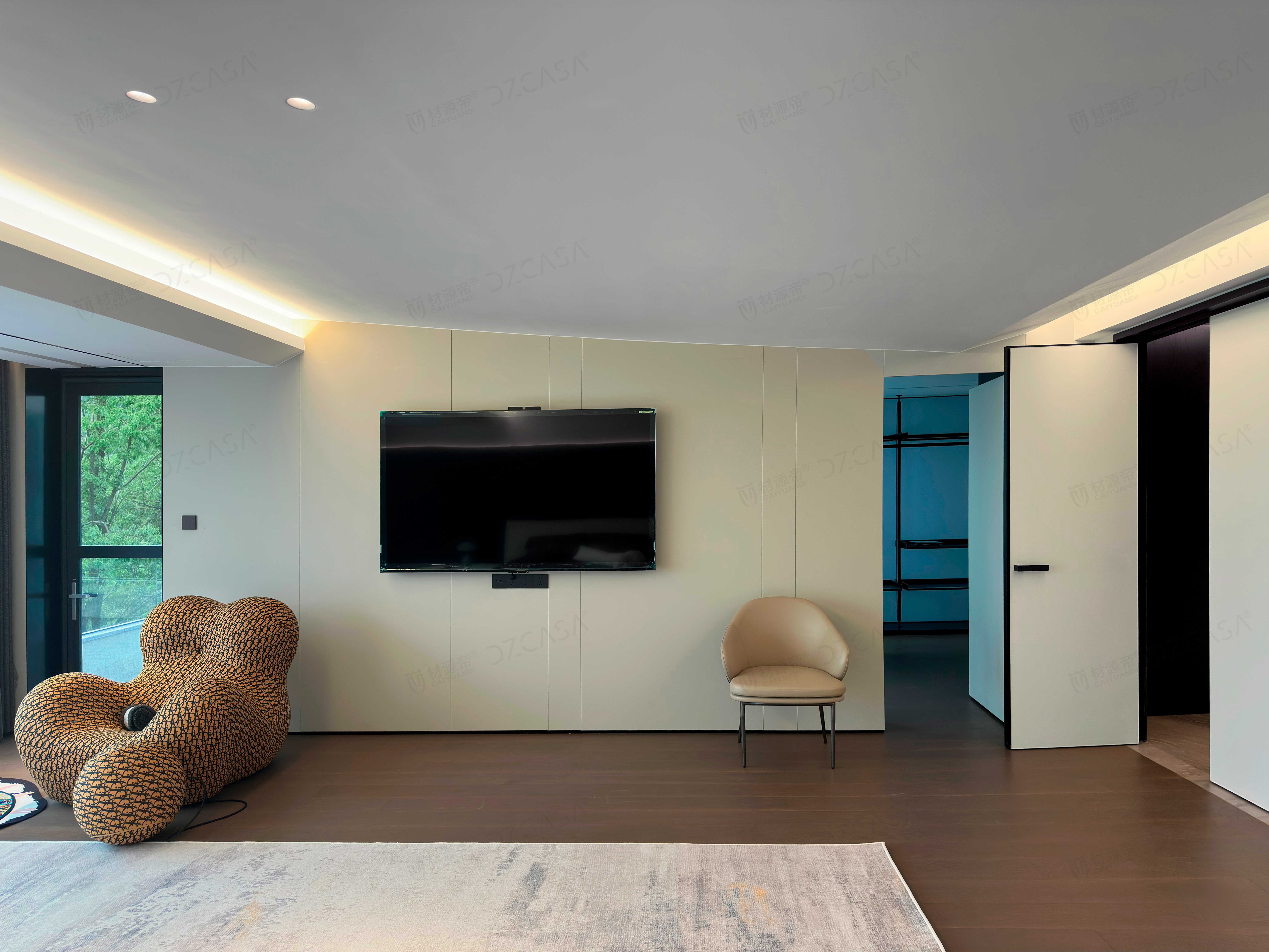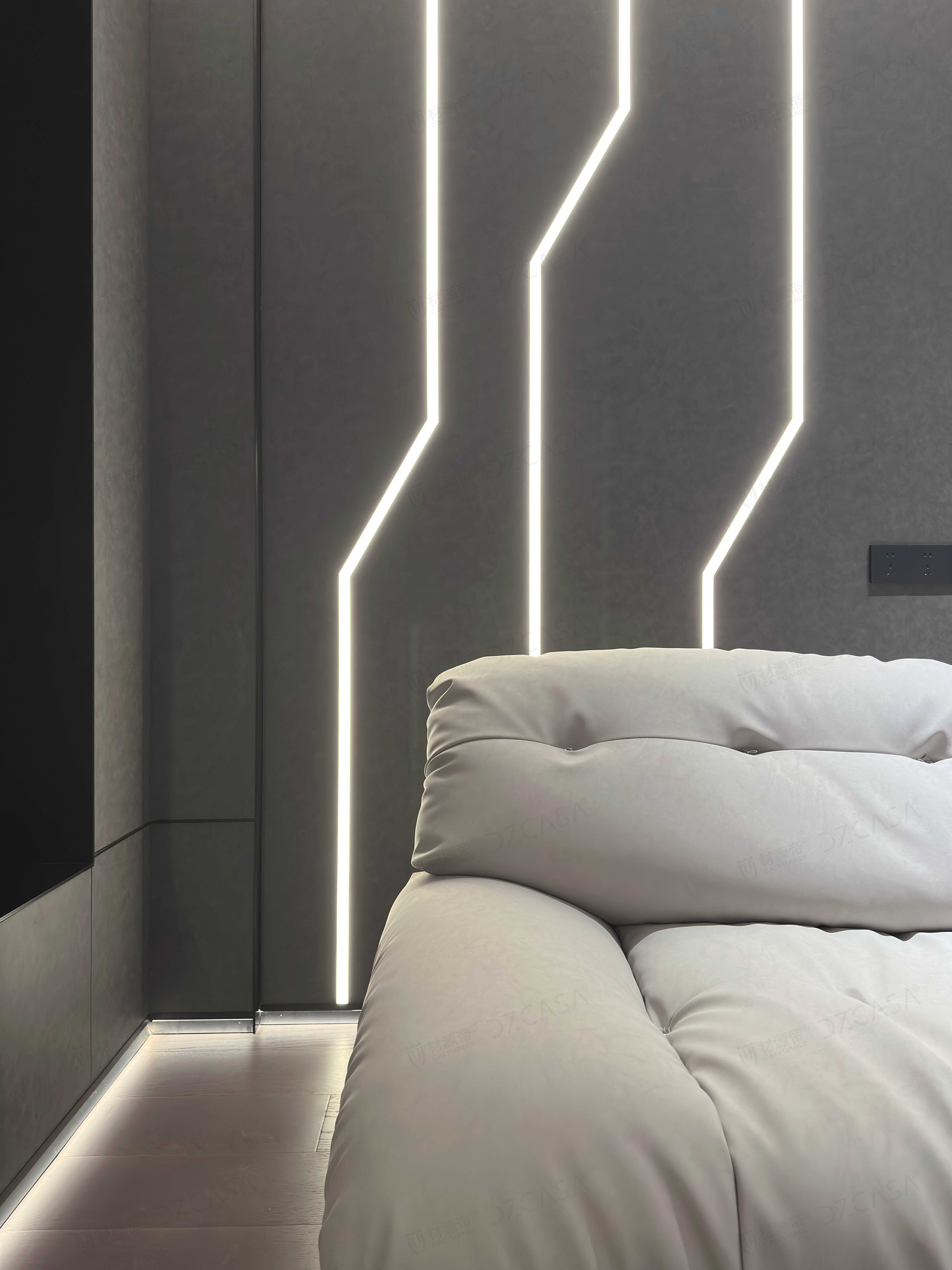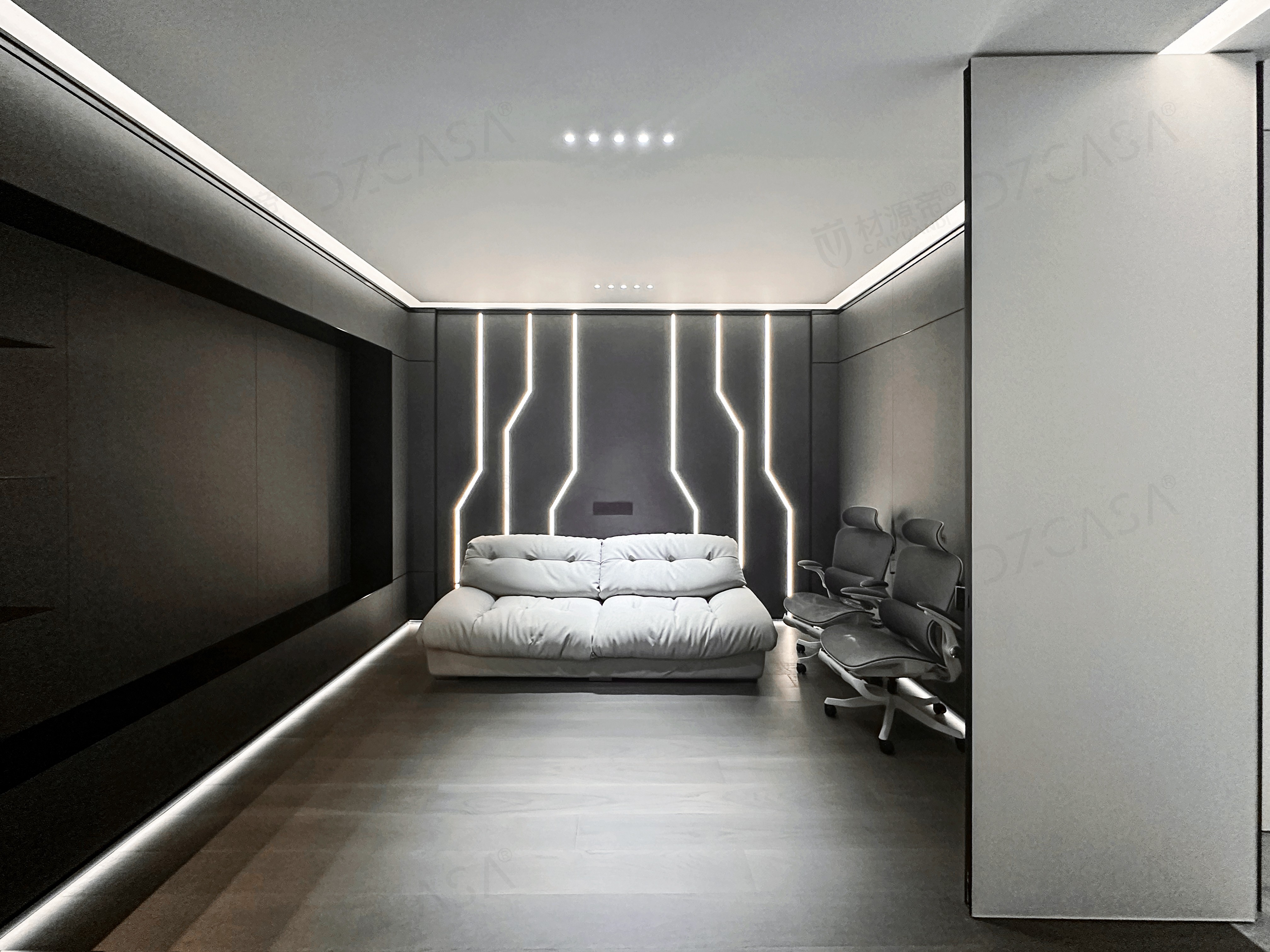 影音室以高级灰为主调,营造沉浸式观影体验。背景墙镶嵌的线型灯带,犹如划破夜色的光之轨迹,在冷峻中注入未来感。光与影在此共舞,诠释理性与浪漫的完美平衡。