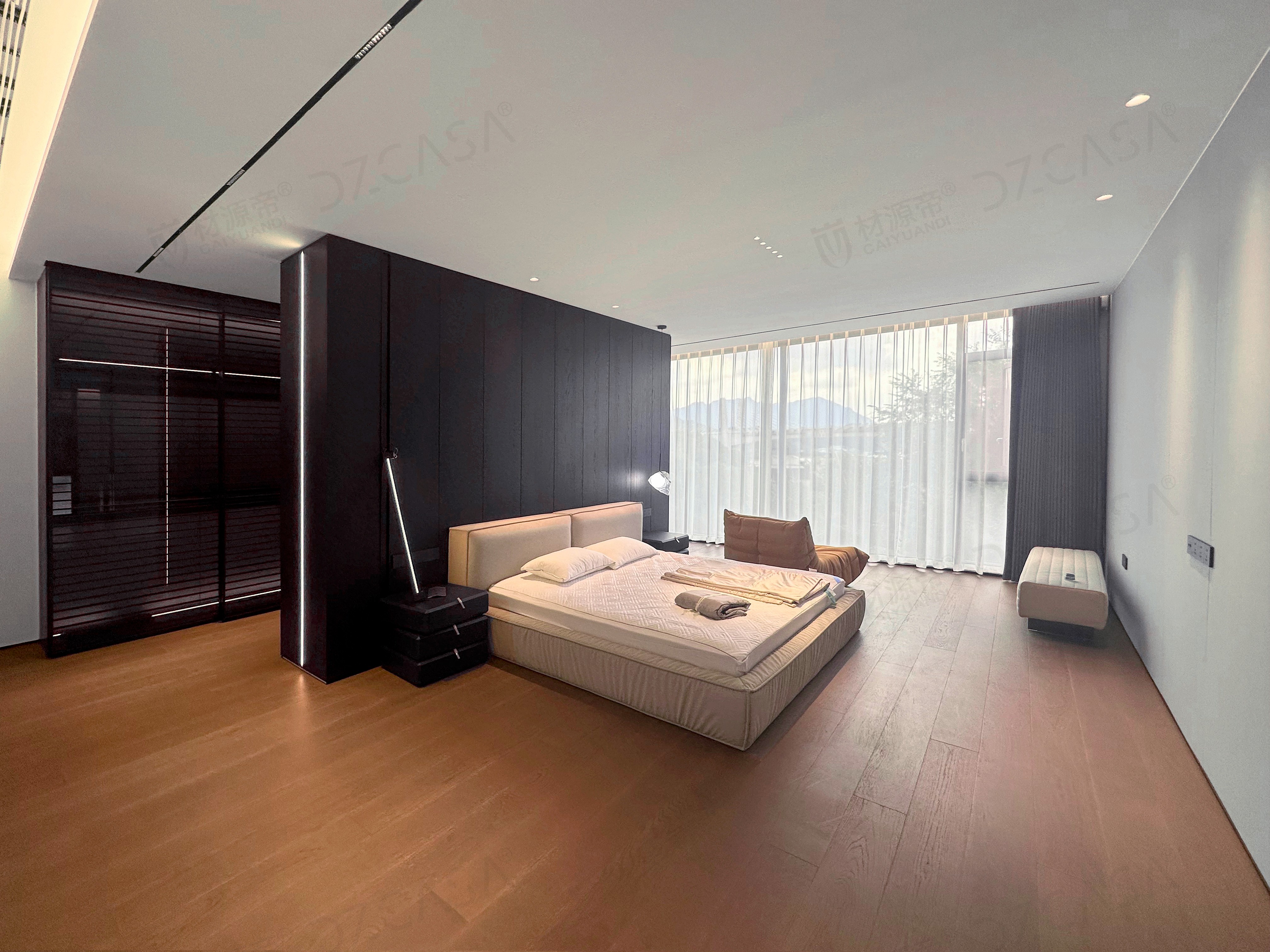开放式衣帽间与睡眠区无缝衔接,顶天立地的深色实木衣柜墙成为空间的核心——它既是高效的收纳系统,亦是沉稳的床头背景,更作为巧妙的空间隔断,界定功能而不割裂氛围。