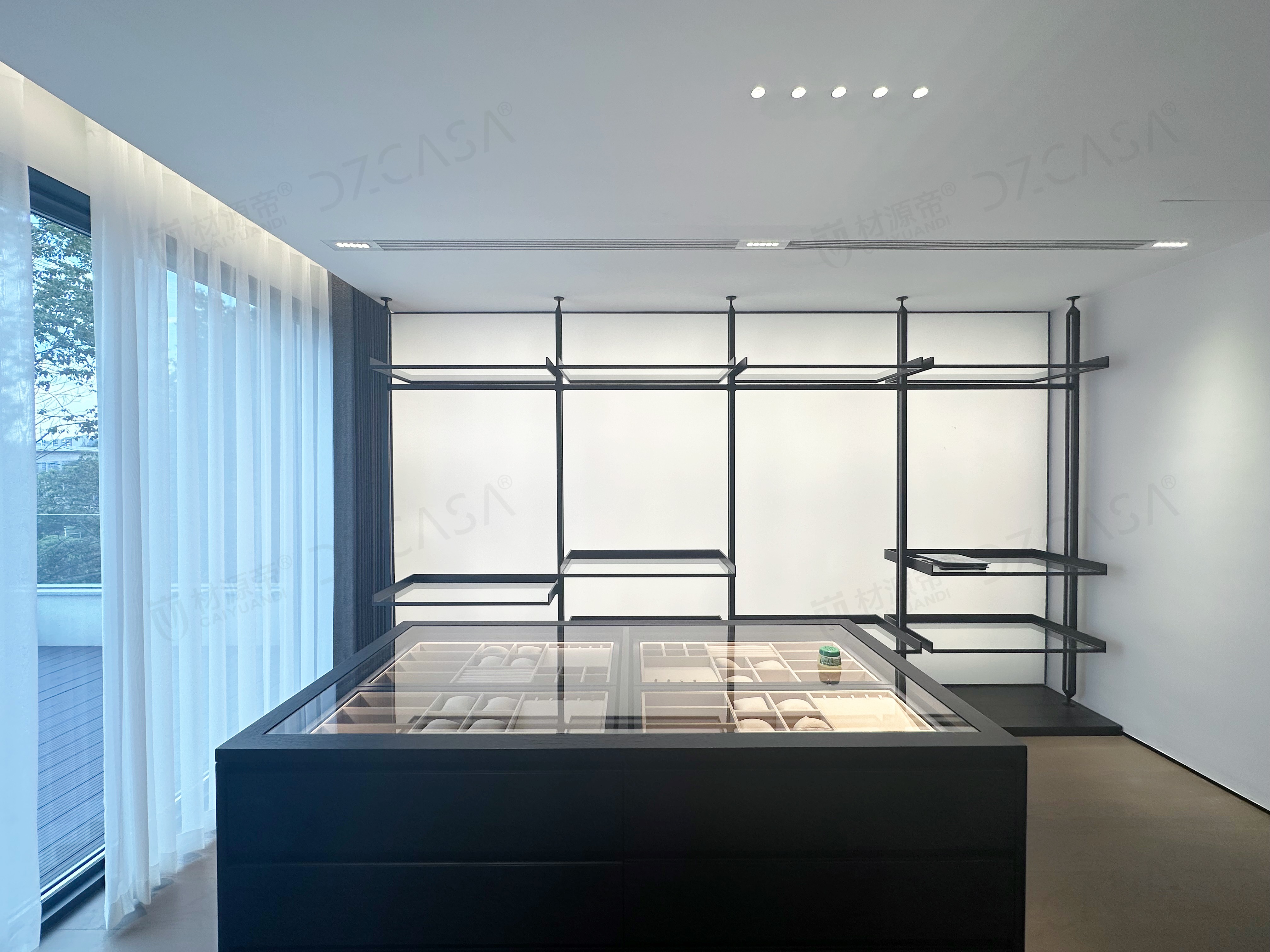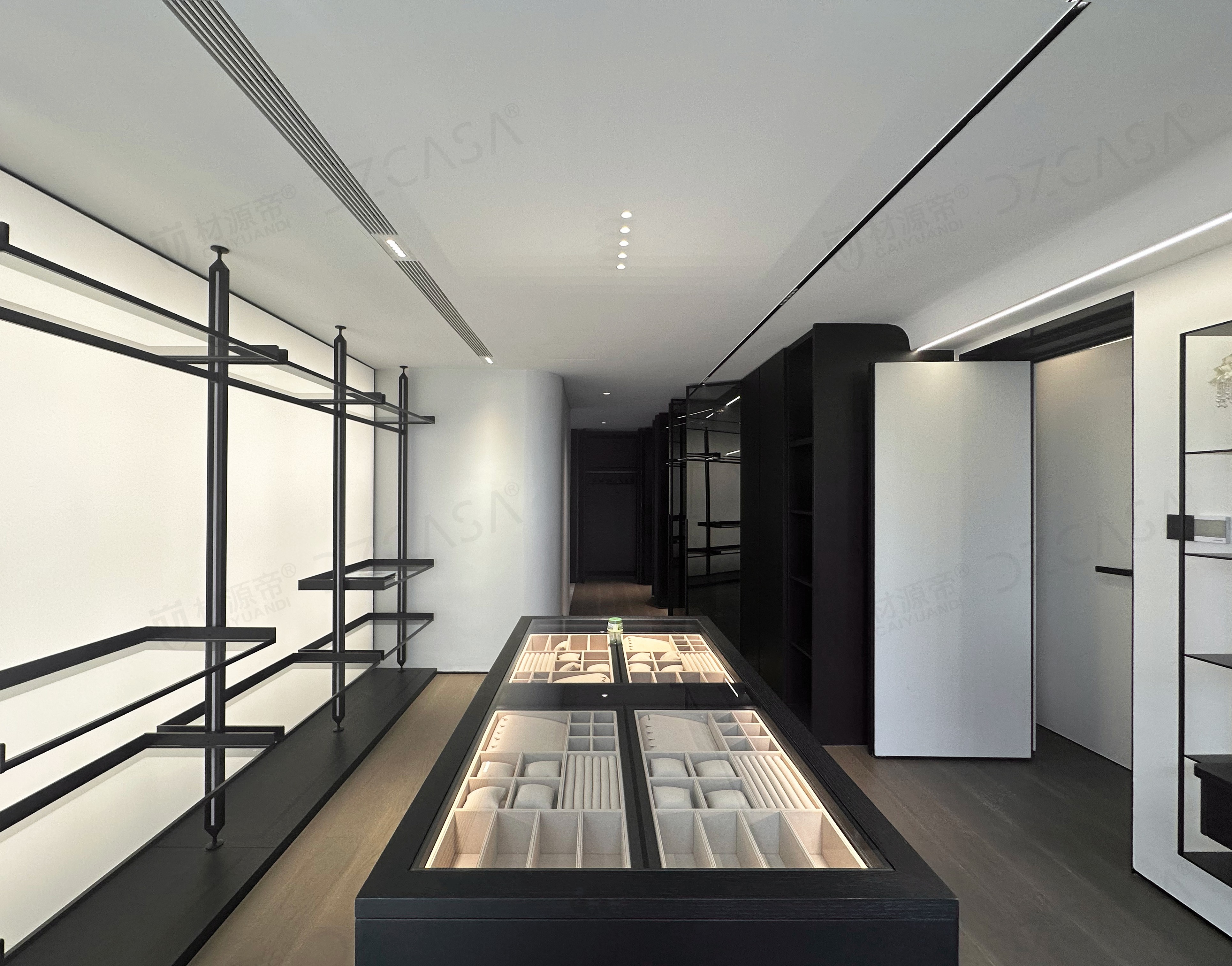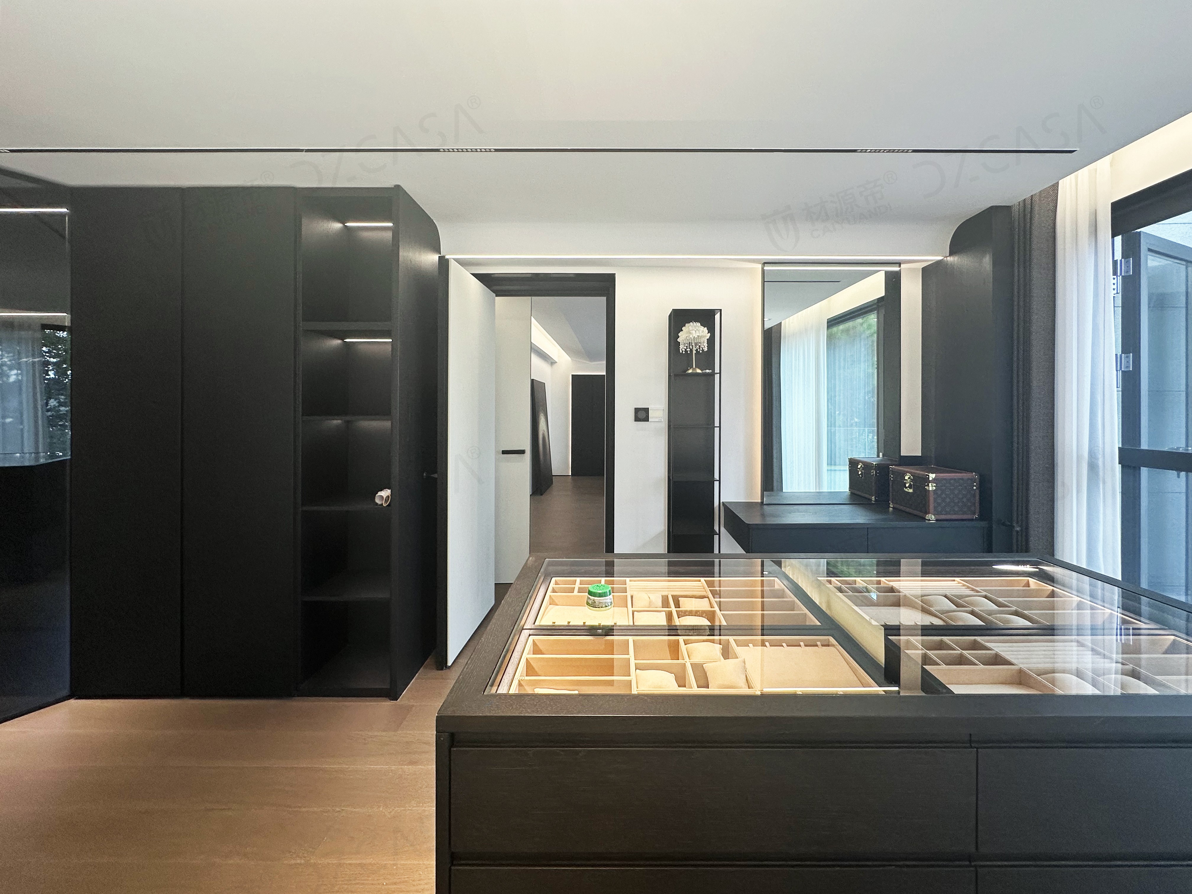 衣帽间以极简架构实现功能美学。一侧开放式层架轻盈通透,一侧实木收纳柜沉稳包容,中央黑色岛台如沉稳屹立。玻璃格内嵌灯带,让藏品宛如艺术展品般优雅陈列。