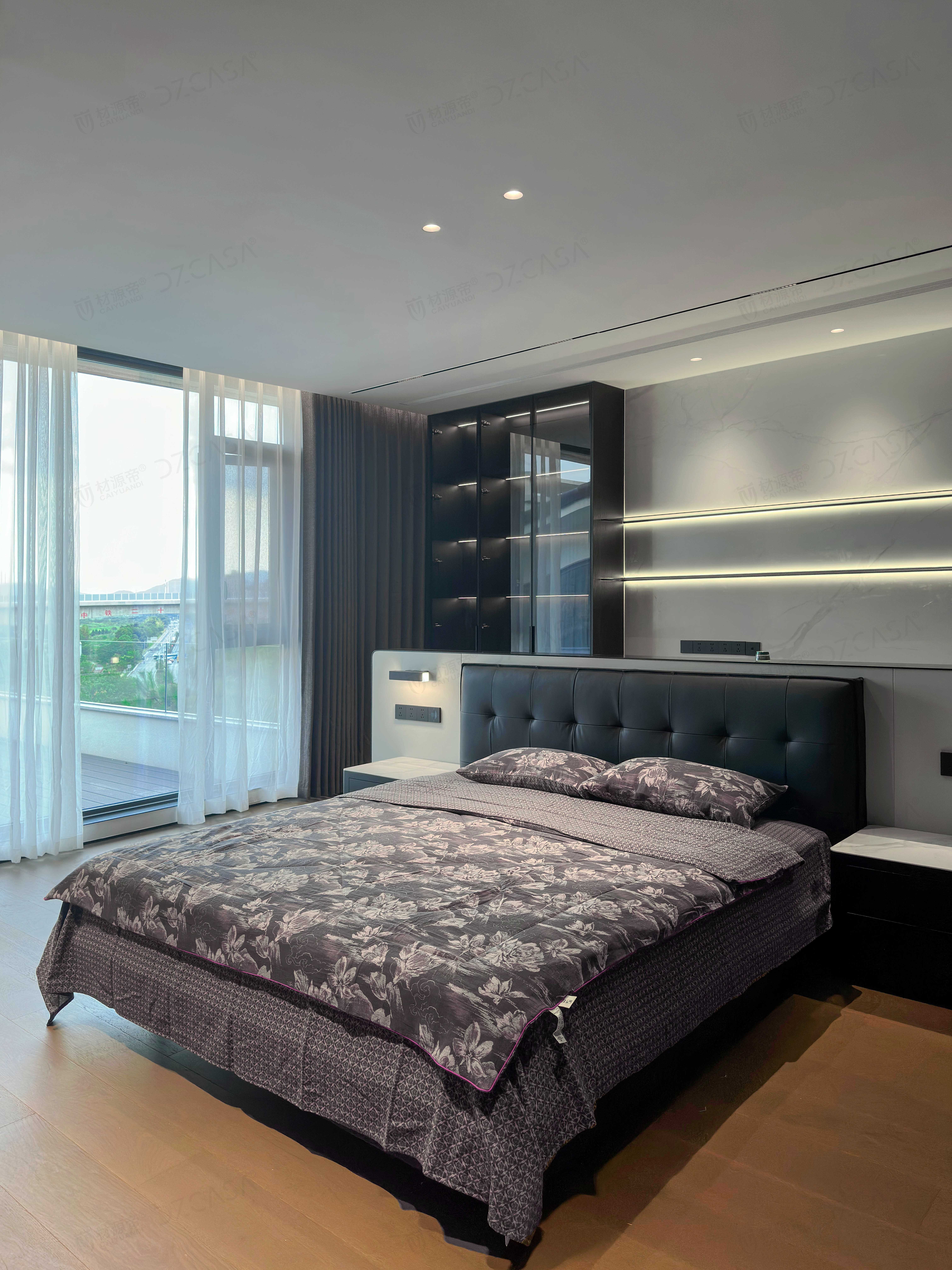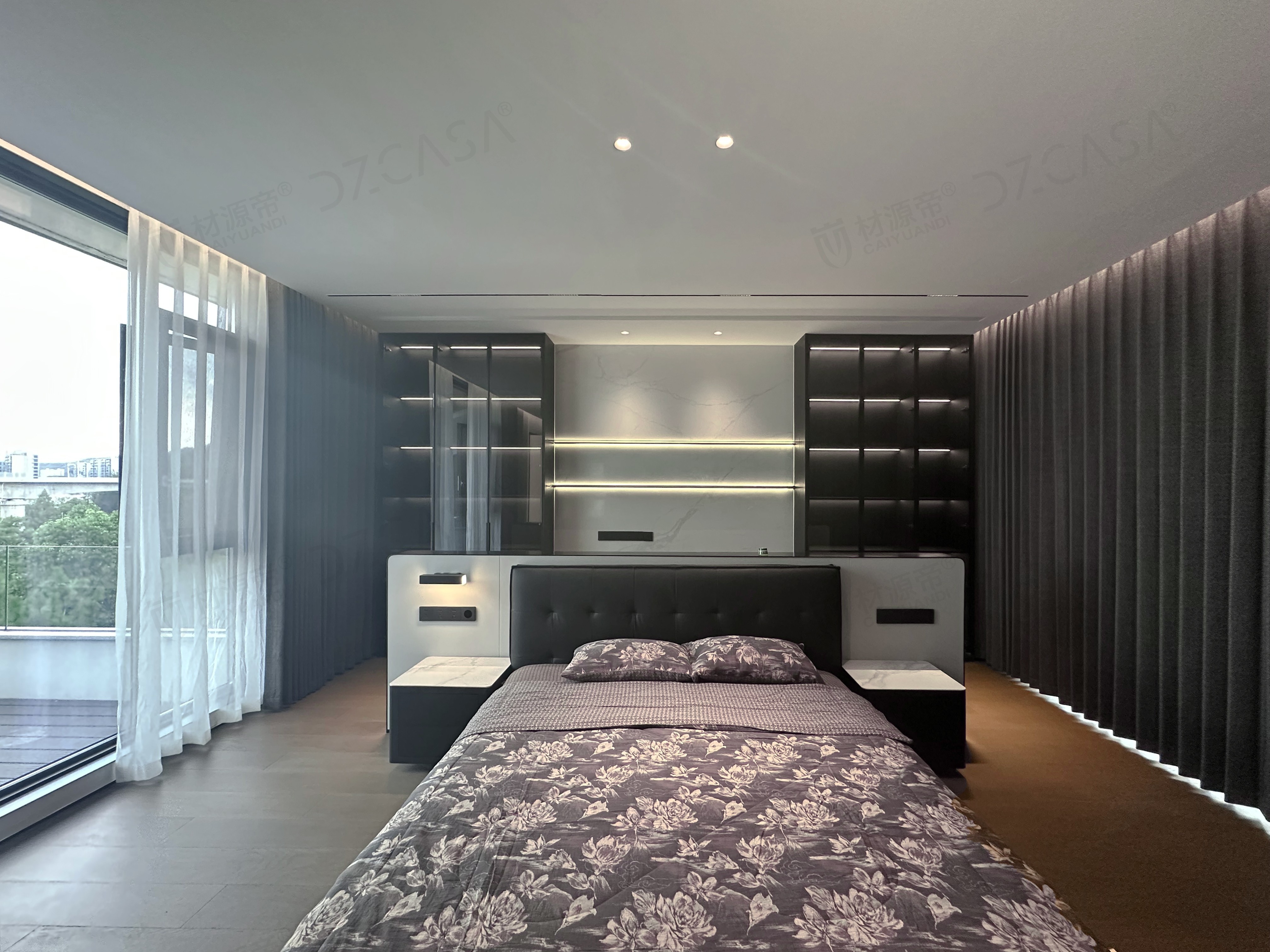 此间卧室以极简笔法勾勒沉静氛围。黑色木饰面背景墙如墨色铺陈,奠定沉稳基调。