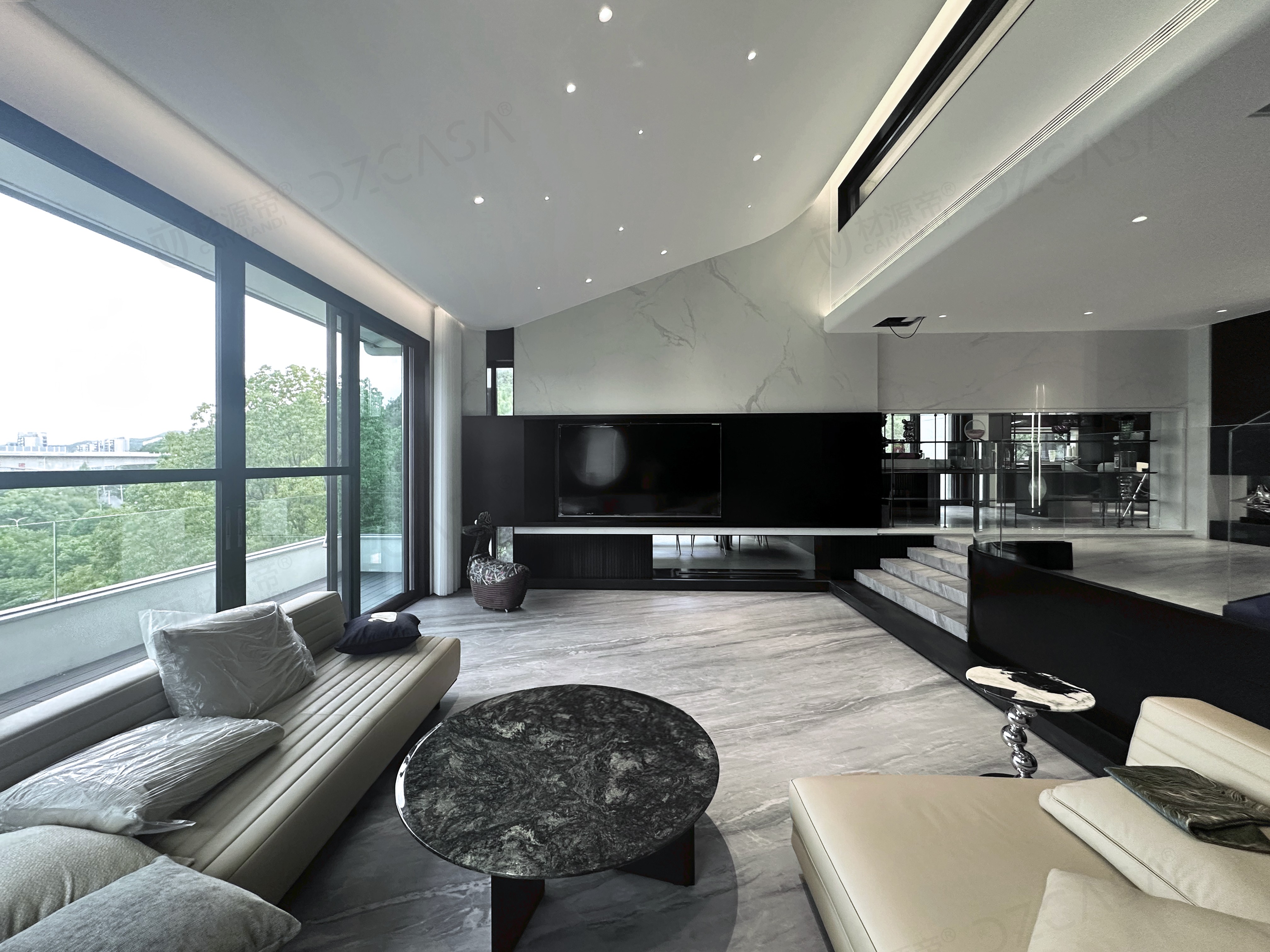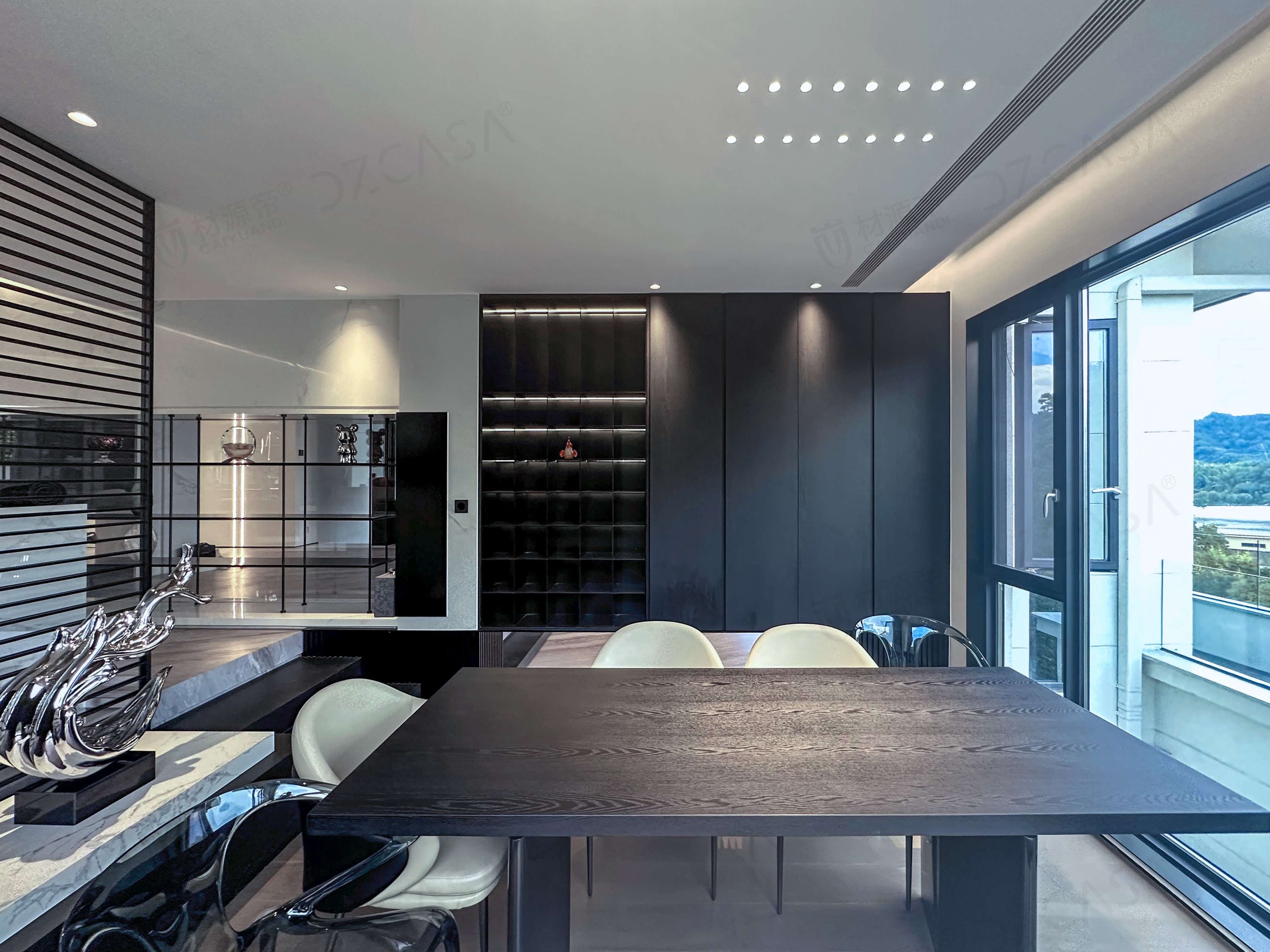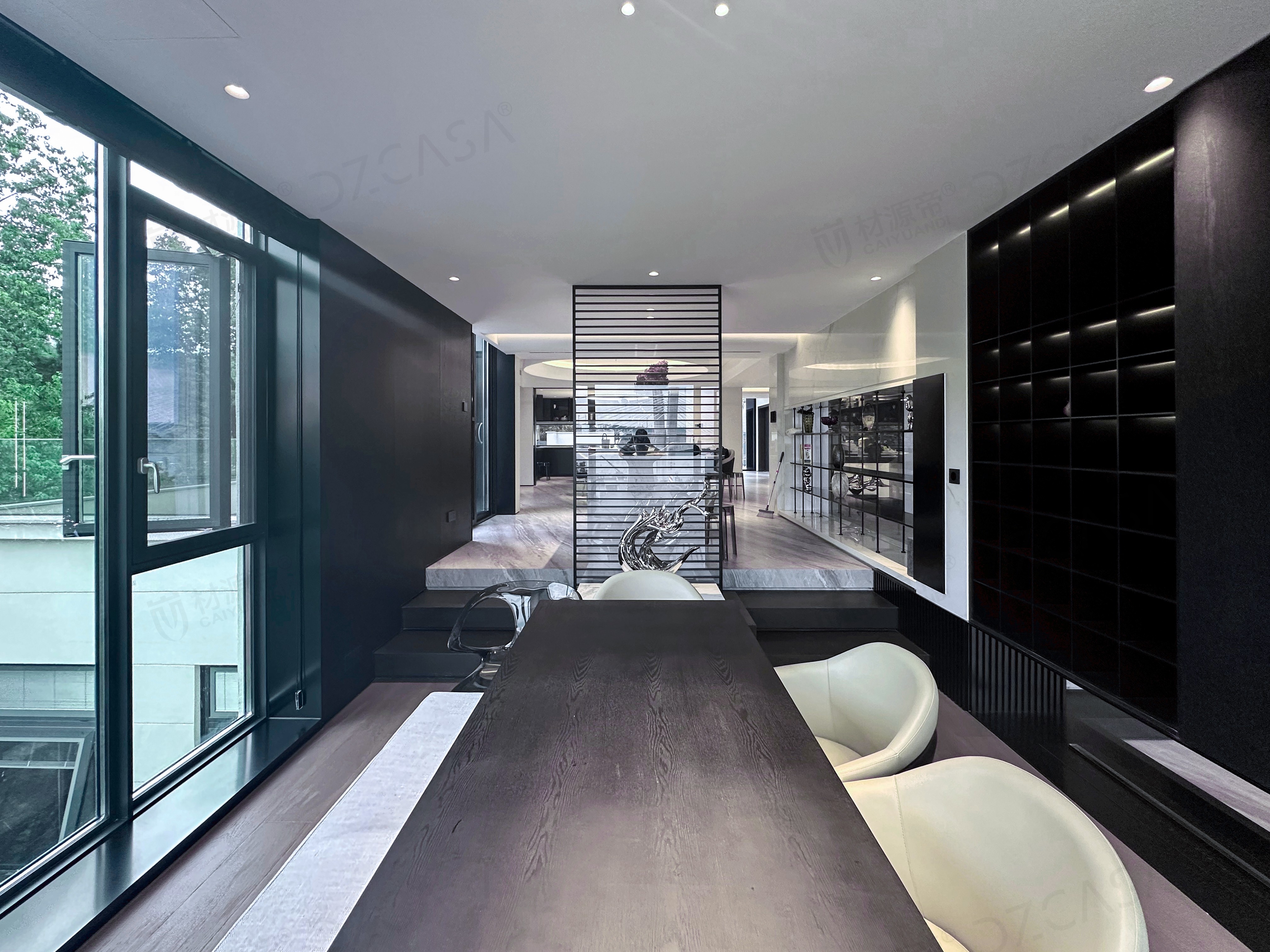 客厅采用大胆的下沉式设计,巧妙划分功能区域,赋予空间沉浸式的包裹感与戏剧张力。整体以经典黑白为基调,纯粹中蕴含无限层次。