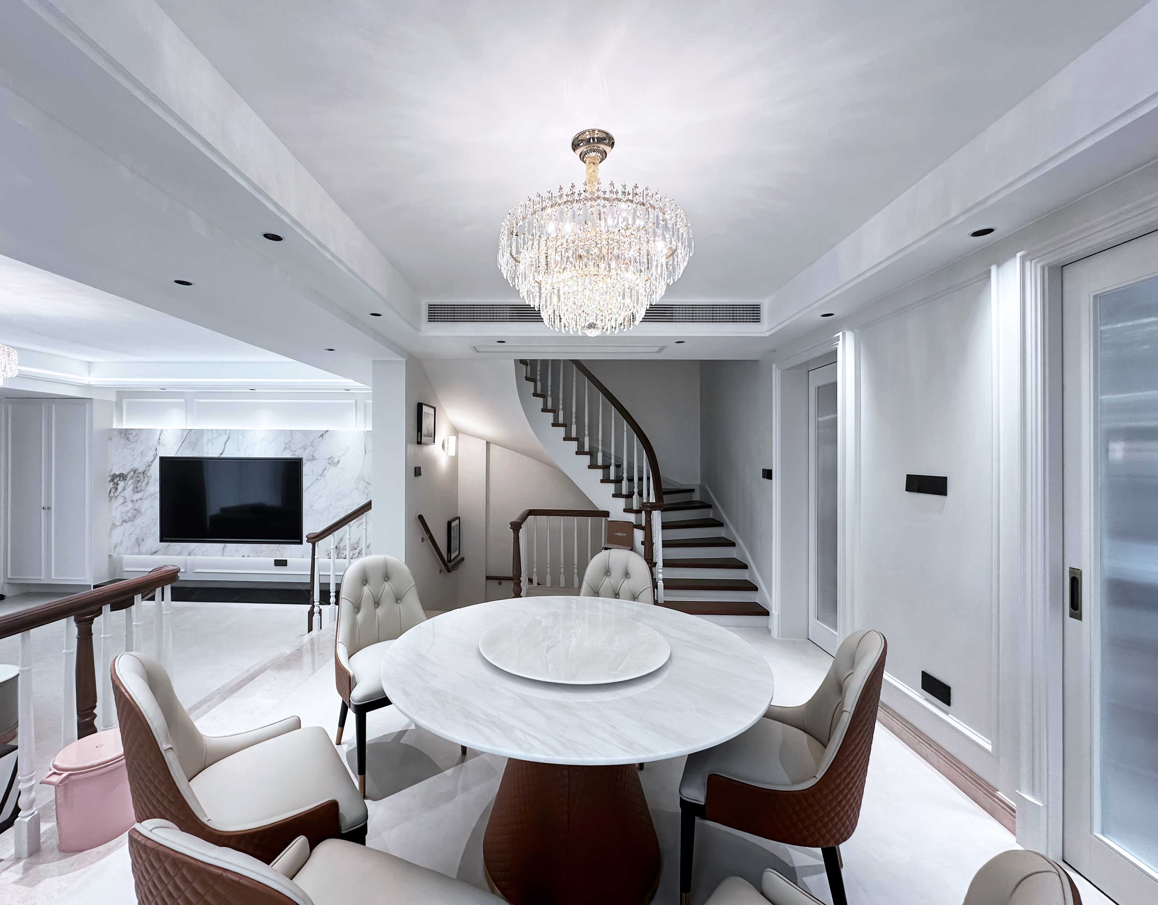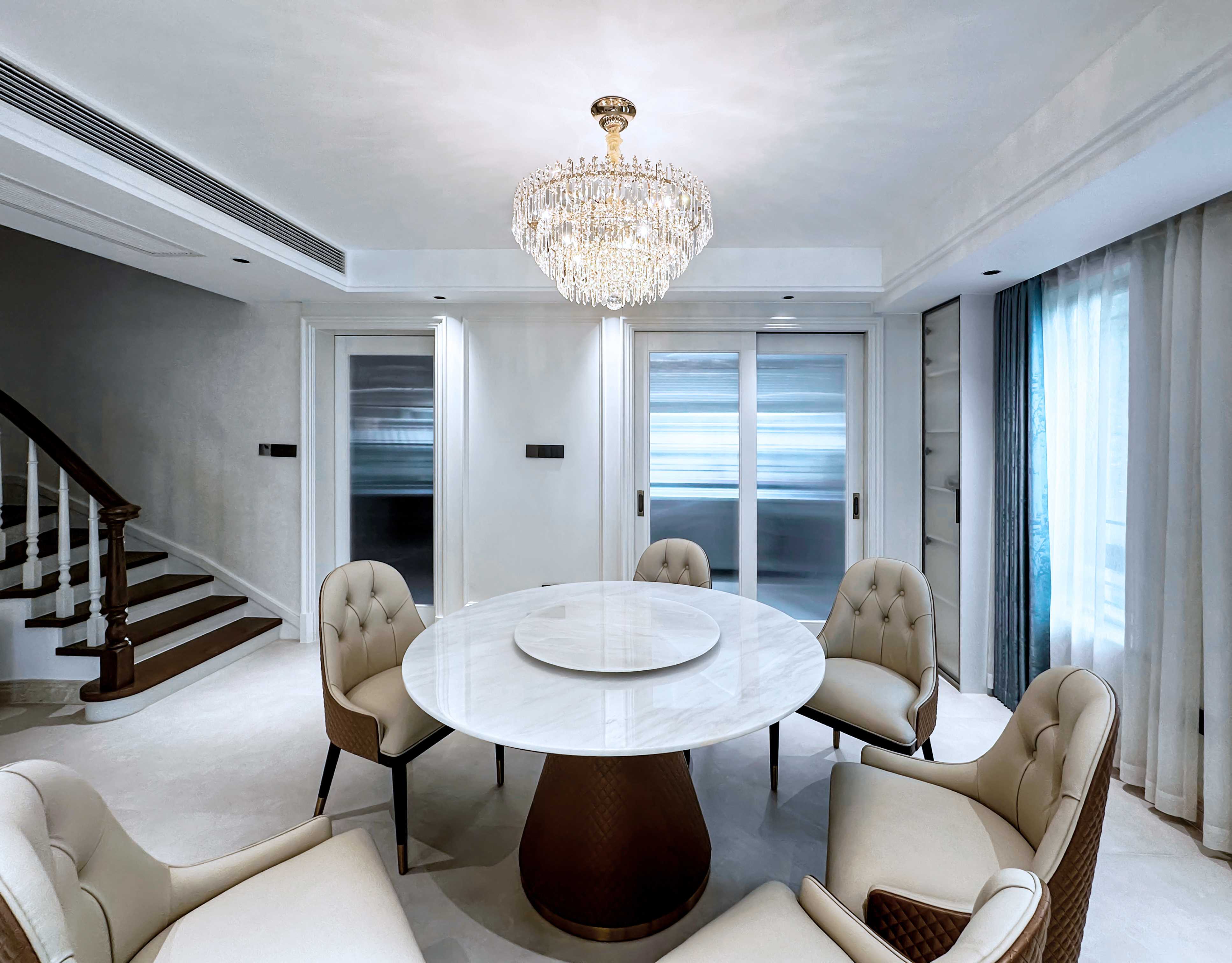 上方垂落的水晶吊灯折射璀璨光影,与中央圆形大理石餐桌相映成趣。浅灰色皮质餐椅以柔和弧线包裹,围合出温馨用餐氛围。