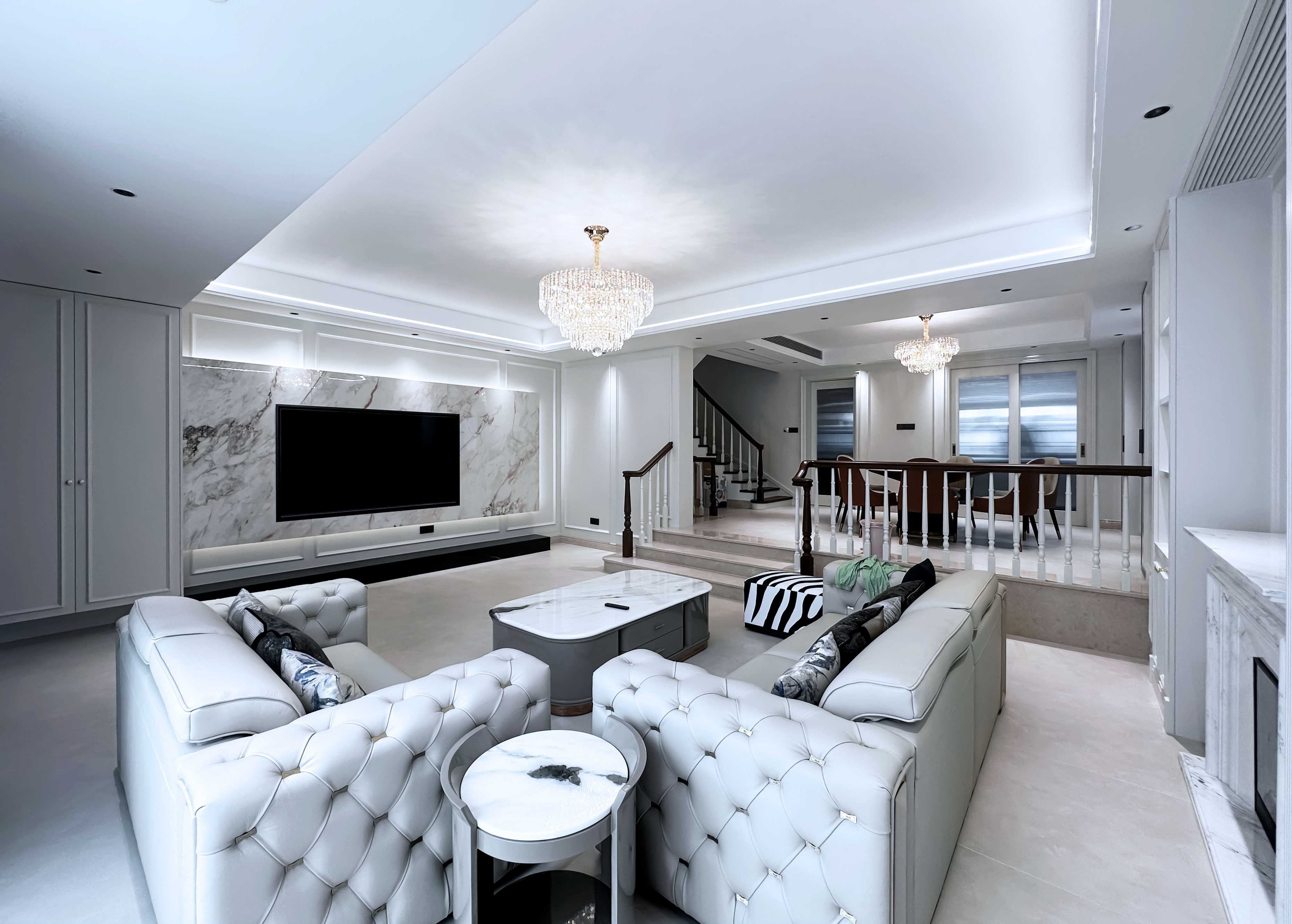 阶梯落差自然划分区域,赋予空间更丰富的层次与围合感,完美诠释现代美式的简约与精致。