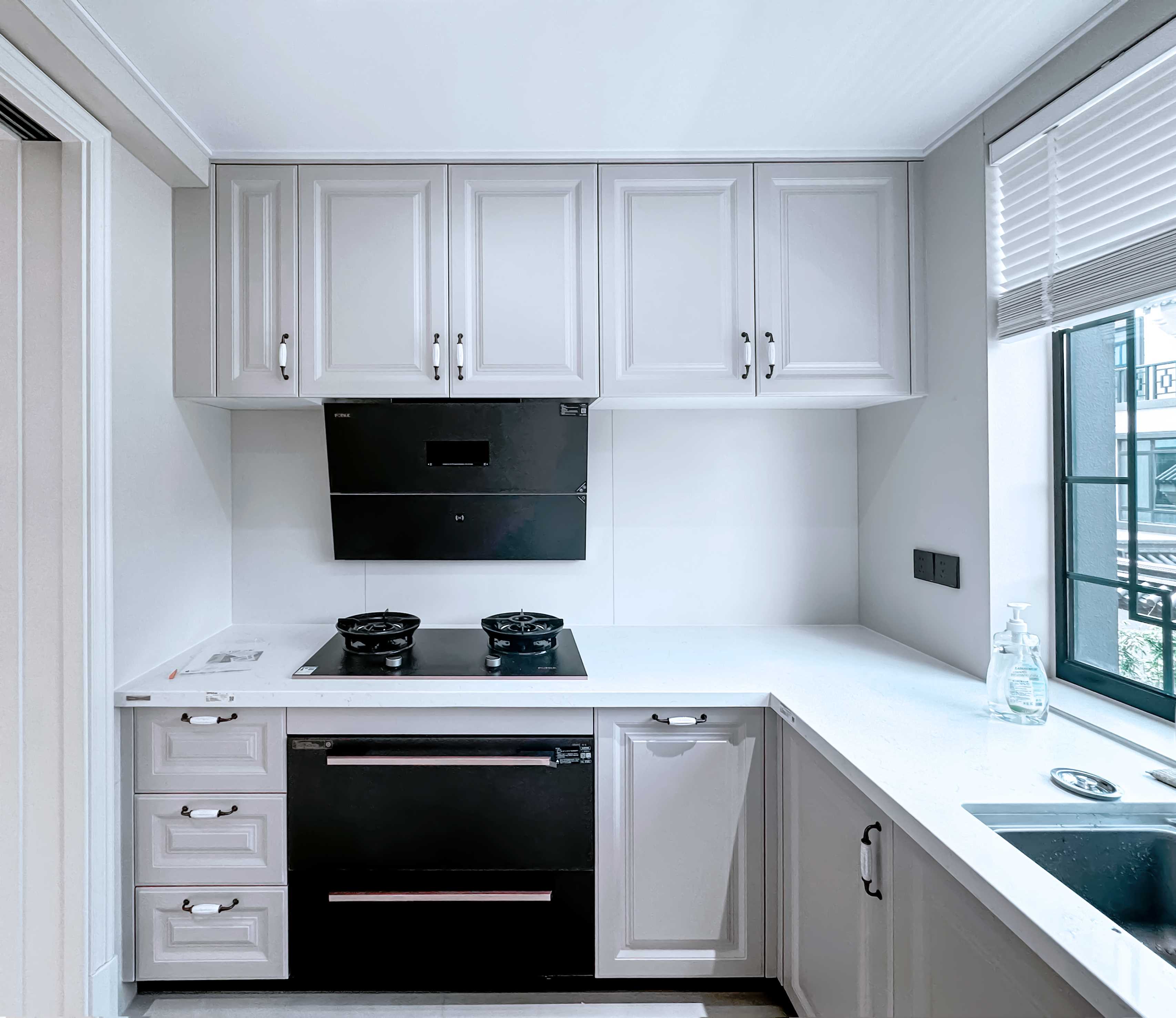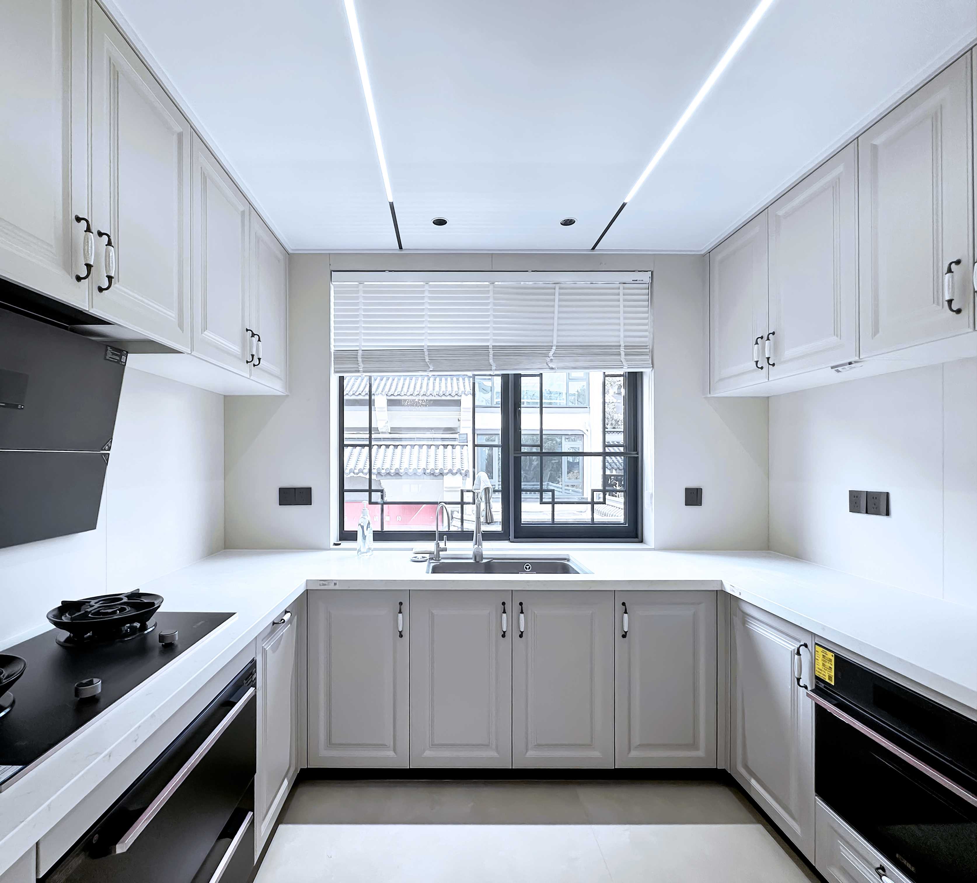 厨房延续纯净白调,U型布局流畅高效,勾勒出简洁明快的烹饪动线。