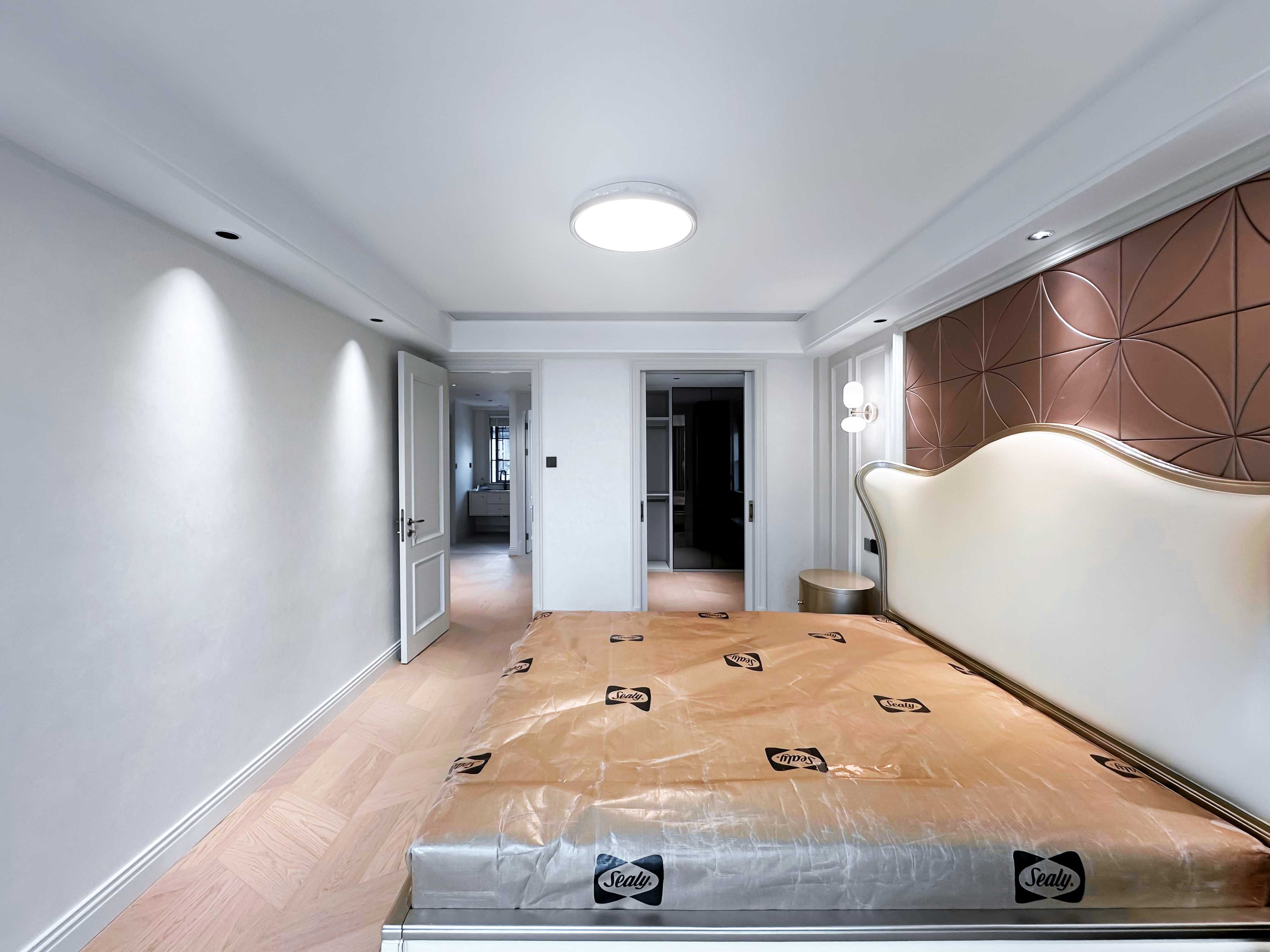 主卧在白色主调中,以低明度棕咖色床头背景墙奠定沉稳优雅的视觉焦点。