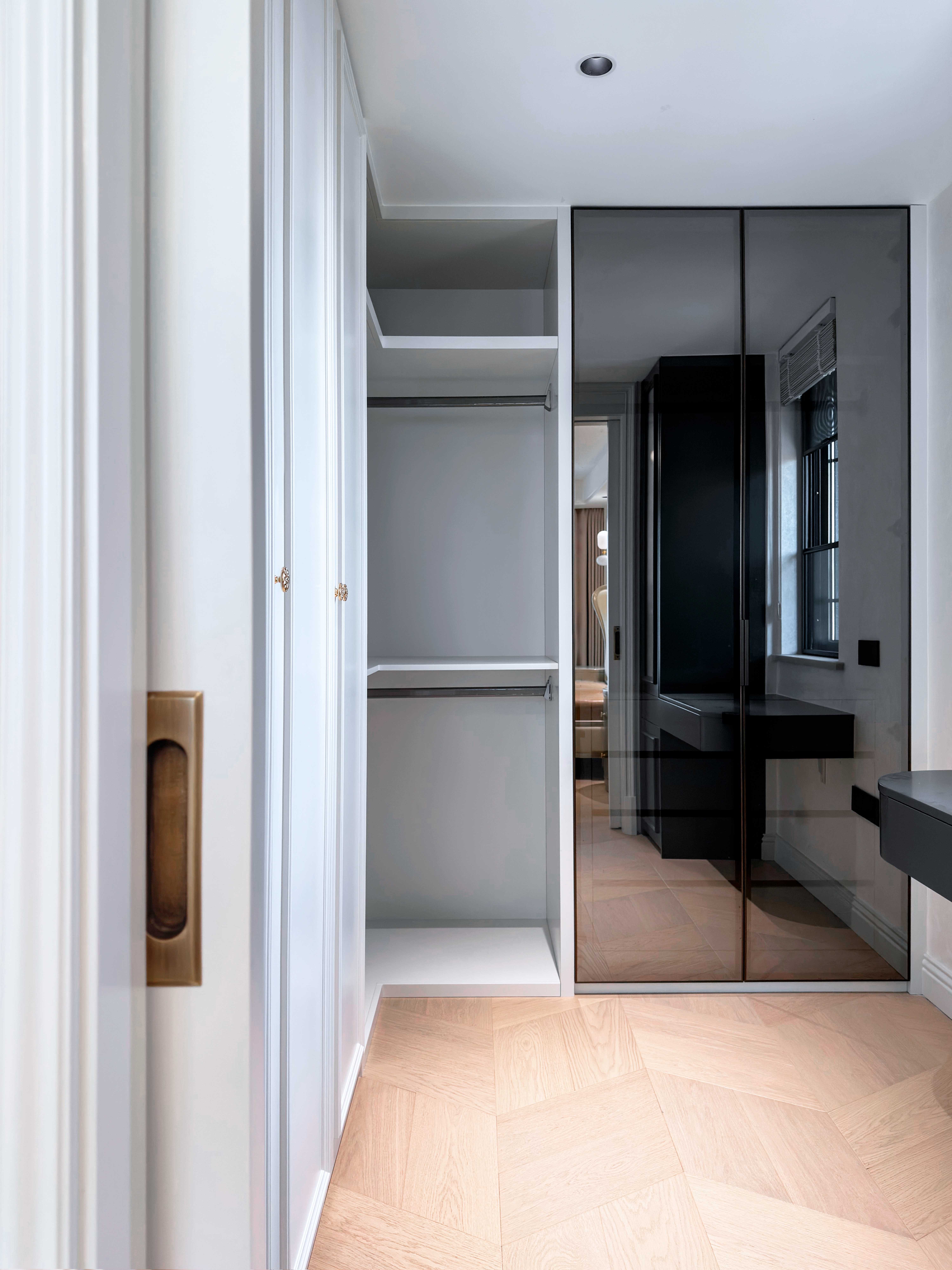 一侧步入式衣帽间采用白色开放格与局部黑色玻璃柜门组合,形成色彩与材质的巧妙碰撞,兼顾展示与收纳功能,于简约中勾勒出丰富的层次美感。