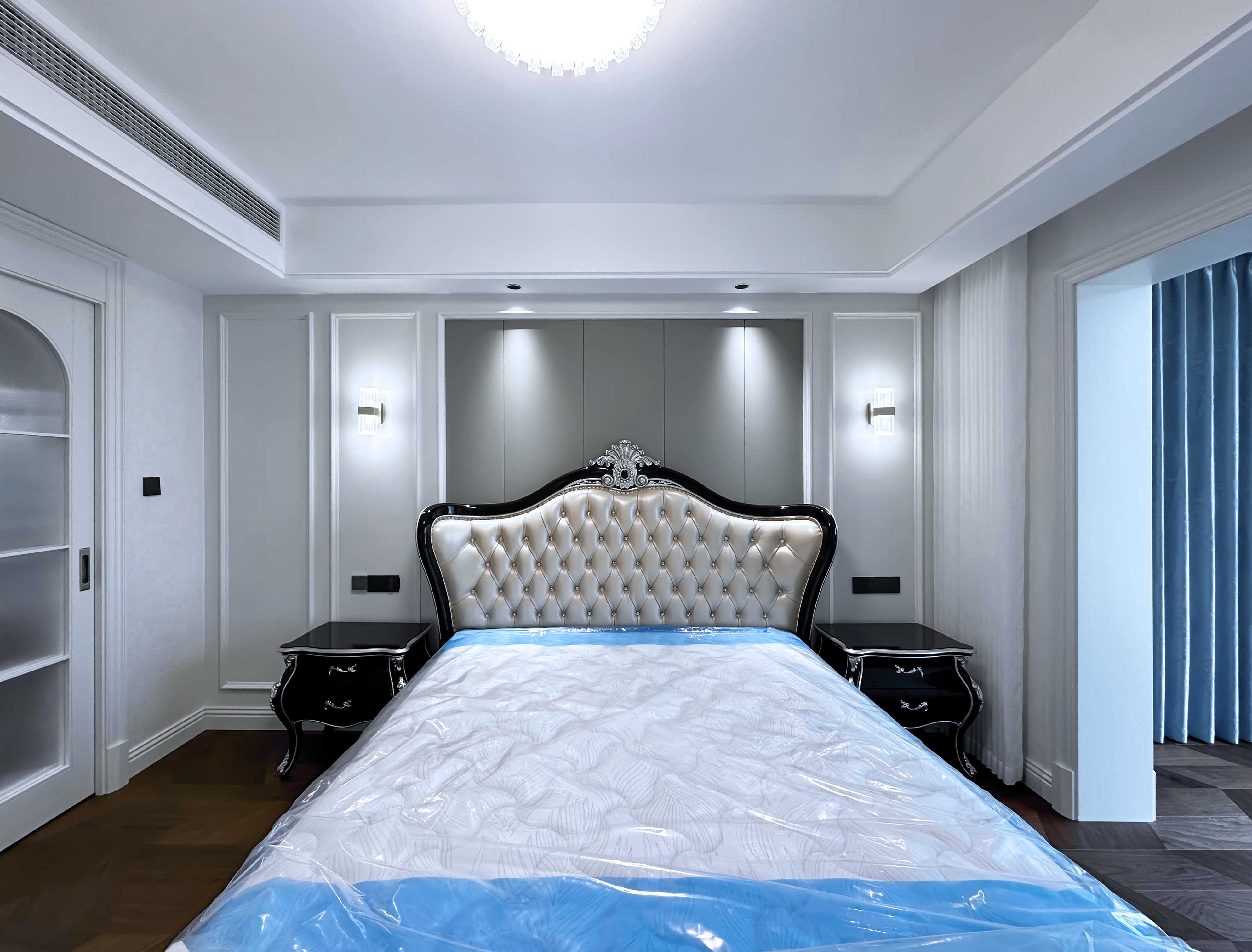 客卧延续纯净色调,白与灰的搭配更显宁静。美式复古造型的床头与床头柜成为视觉主角,优雅的雕花与做旧质感无声诉说着经典。