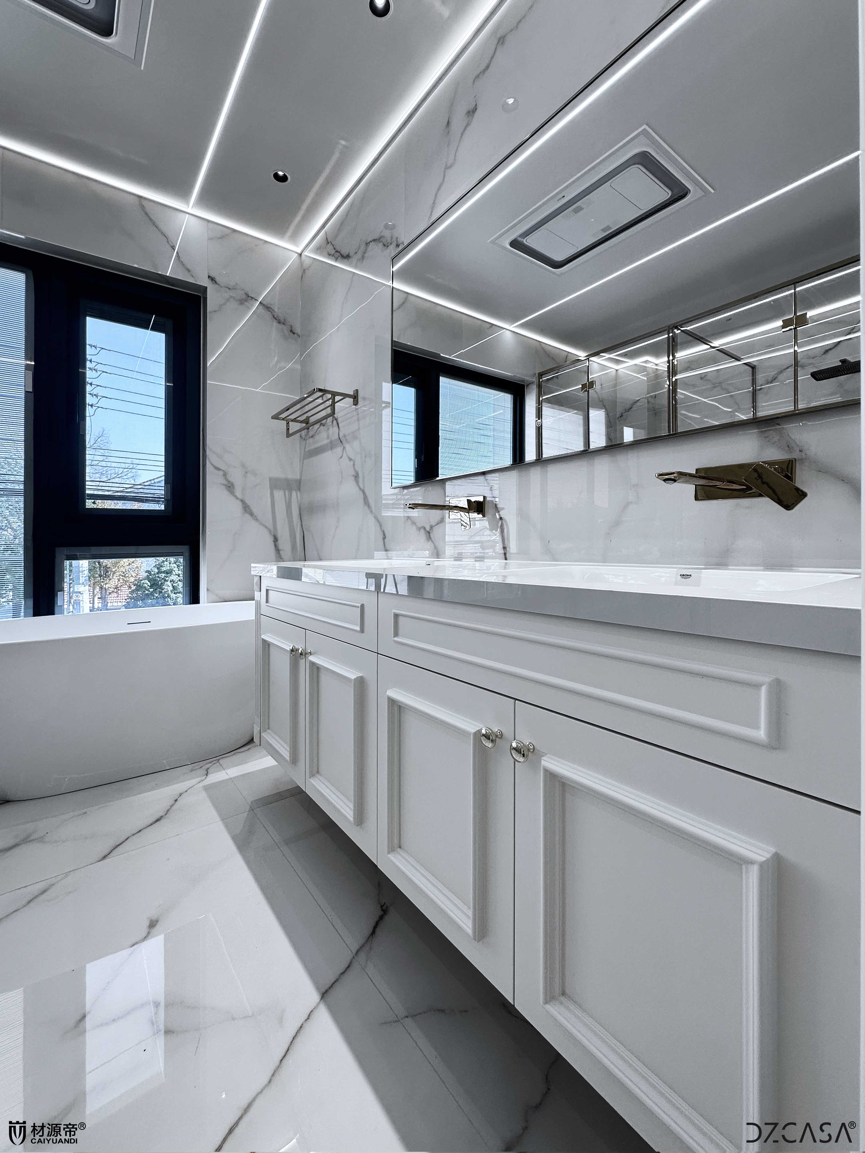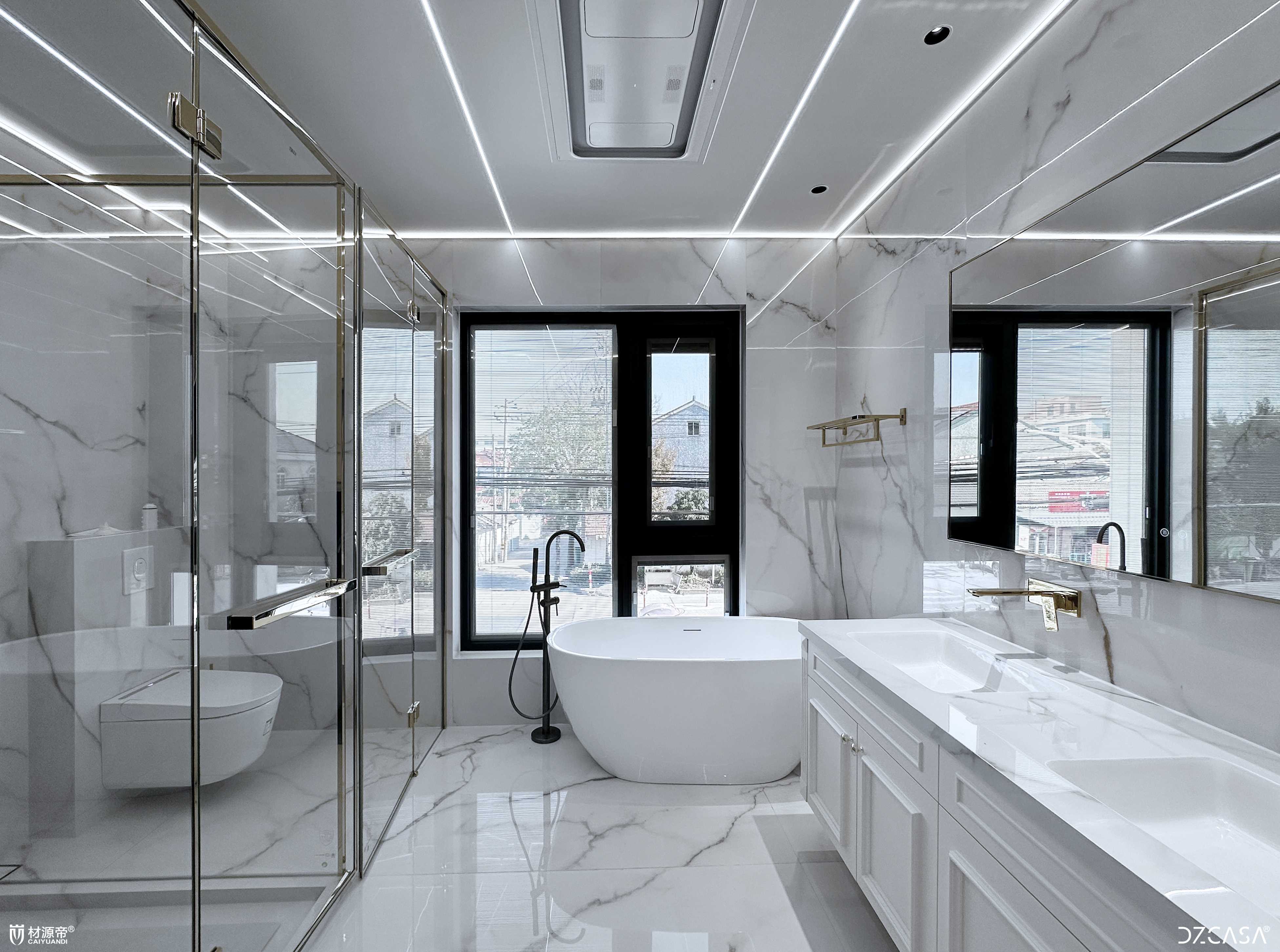 卫生间如同被晨光浸透,白色大理石墙面晕染着水墨般的灰纹,线型灯带为整个空间披上极简时尚调性。