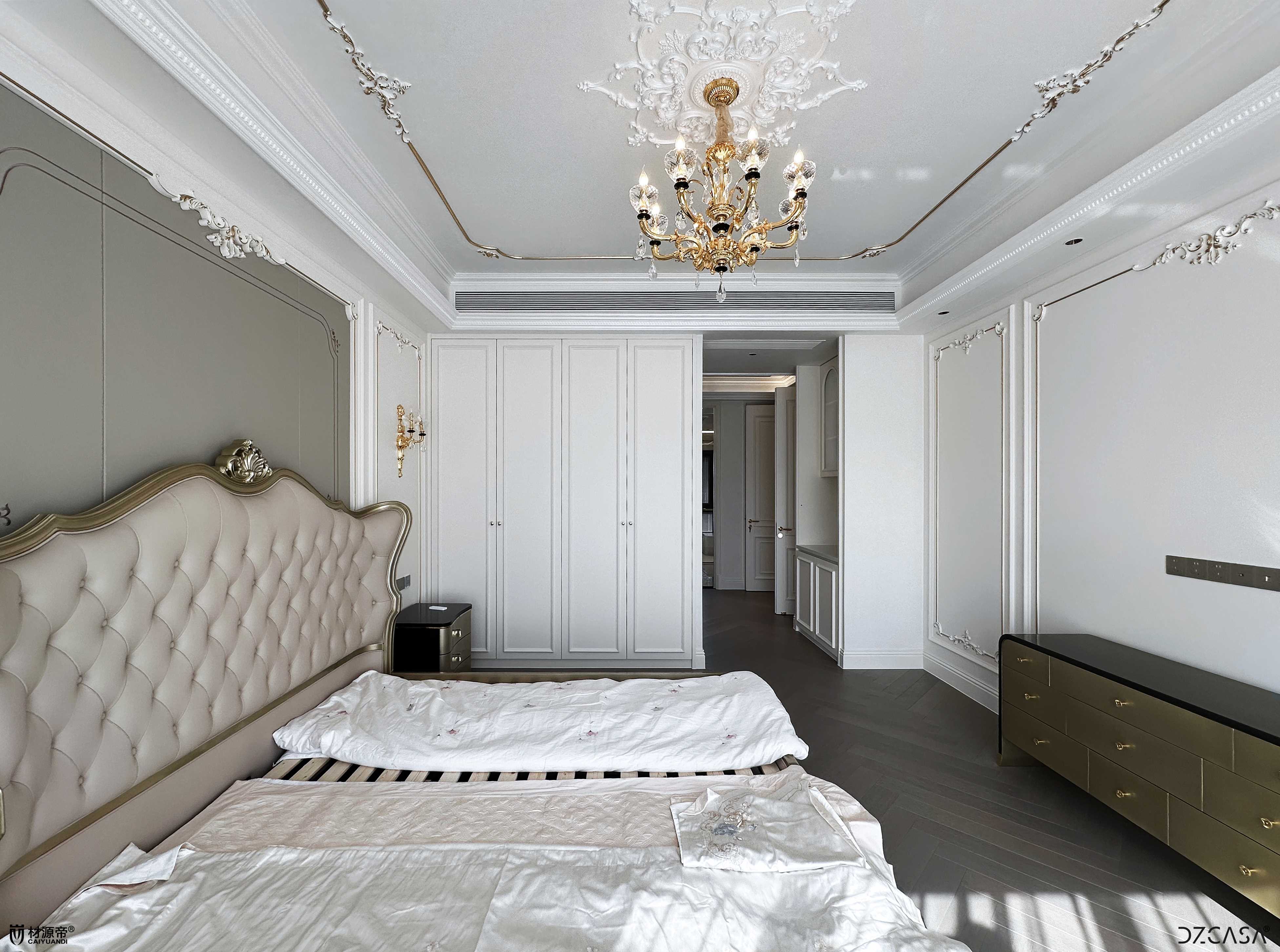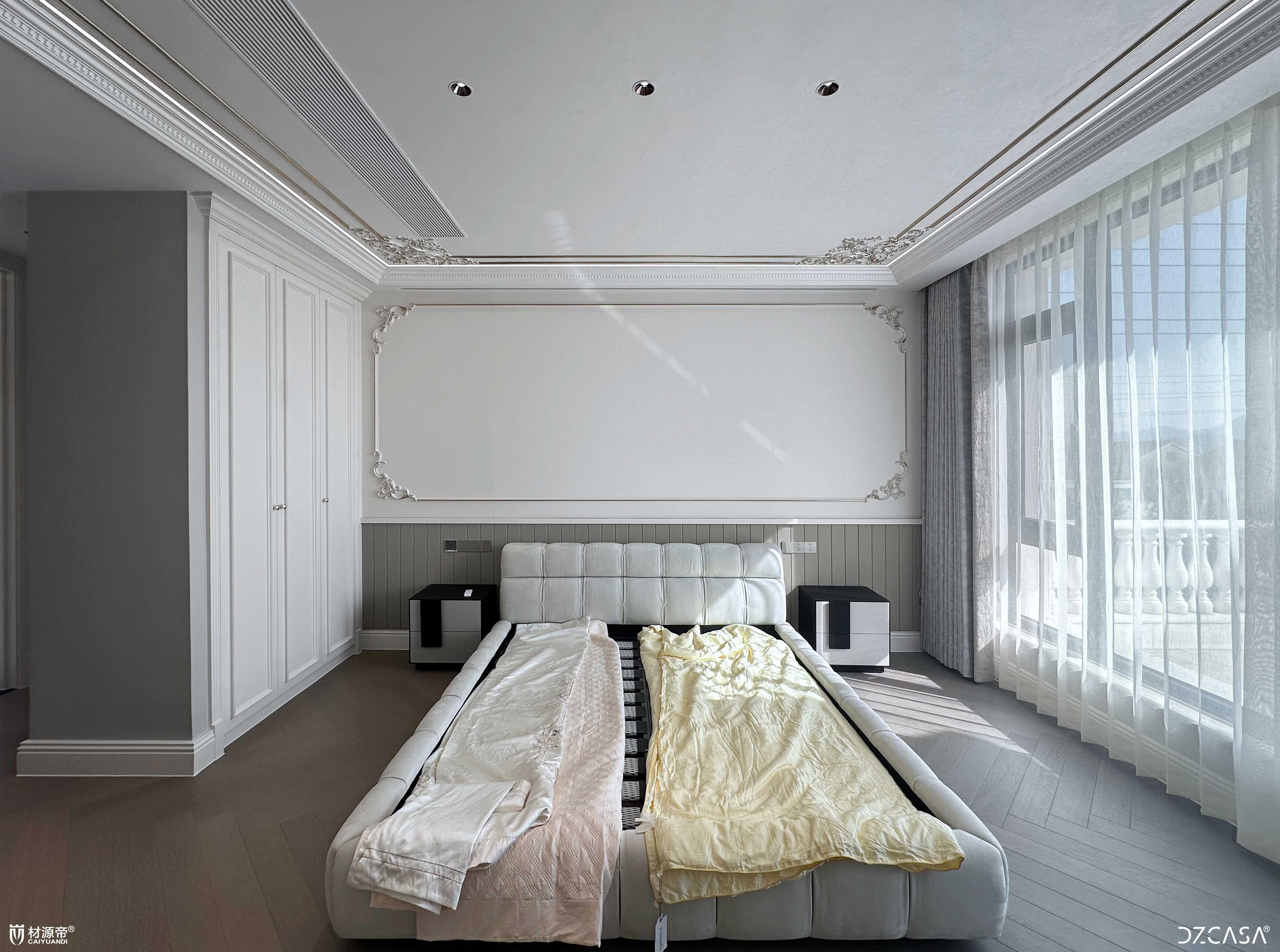 这间卧室以更纯粹的灰白色块铺陈。无主灯的设计让光线均匀漫射,描金雕花被极致简化,只在天花线脚与墙面收边处隐约浮现。