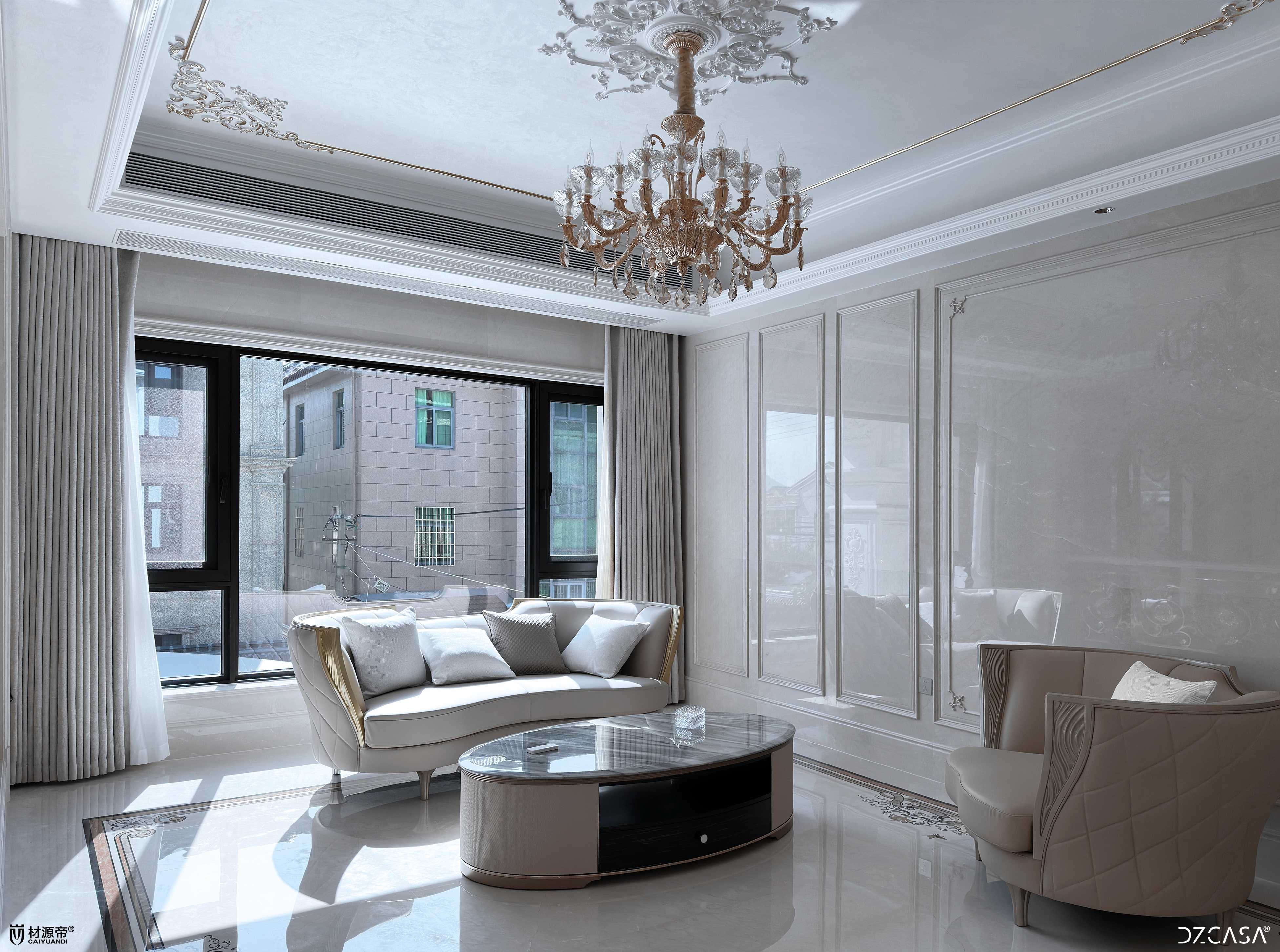 光影漫过落地窗,将整个会客厅沉浸在柔和的明亮里。香槟金的不规则茶几置于中央,与吊顶水晶灯交相辉映,折射出细碎光泽。